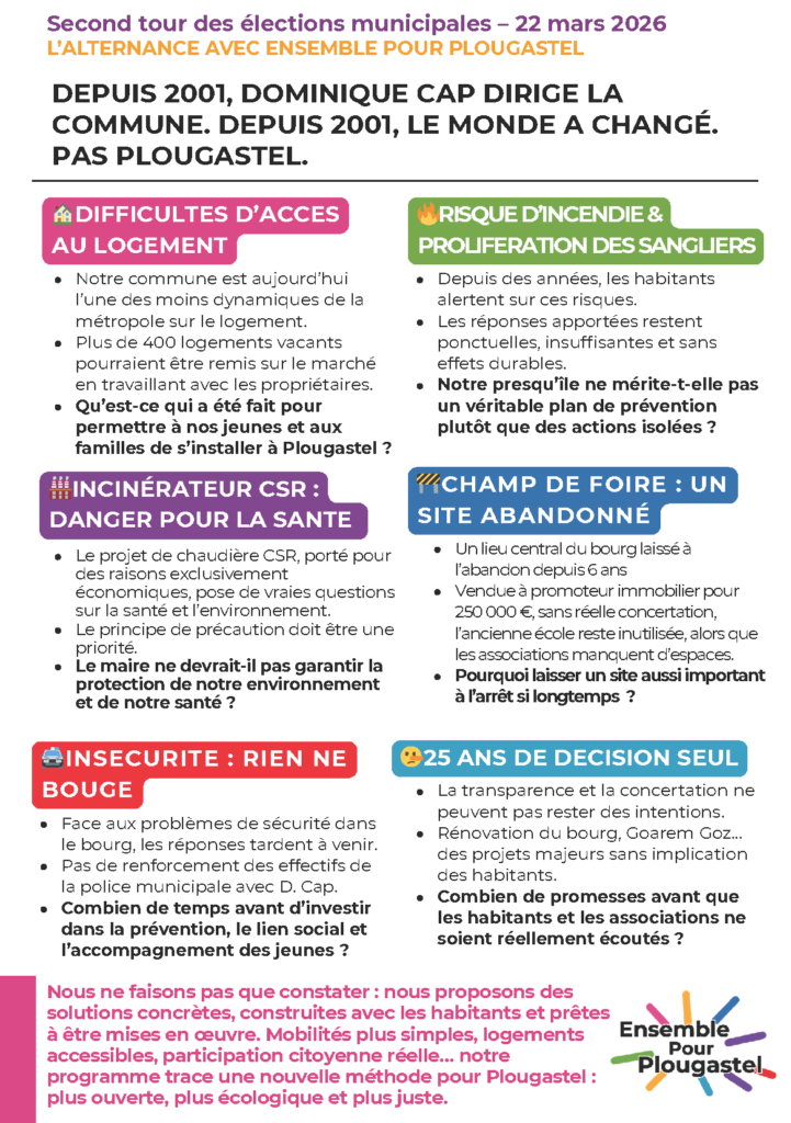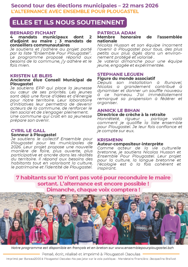 À l’approche du second tour des élections municipales du 22 mars 2026, le collectif Ensemble pour Plougastel propose une alternative claire, construite avec les habitants et tournée vers l’avenir.